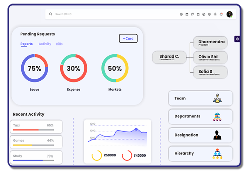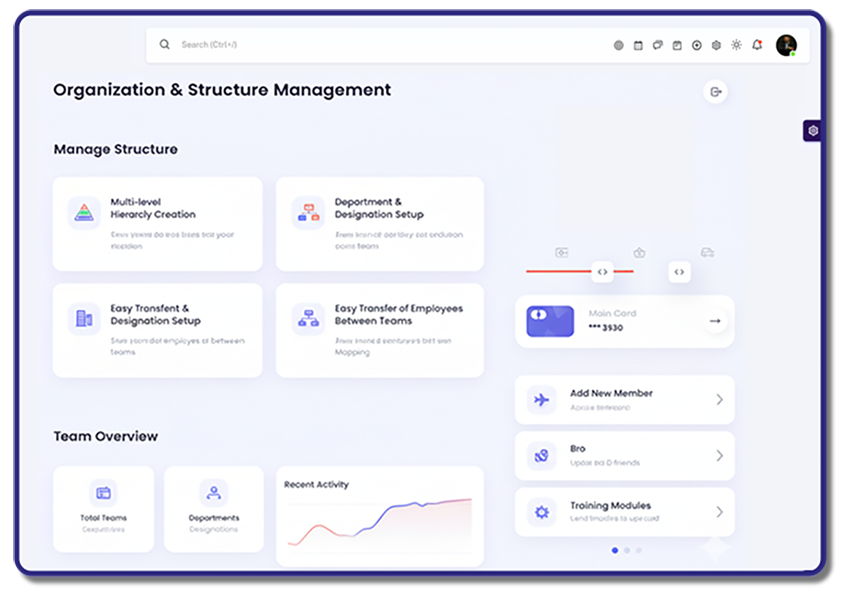This module helps businesses build a well-defined organizational structure and hierarchy. It ensures employees, departments, and designations are organized in a smart way so that reporting, accountability, and workflows remain clear.